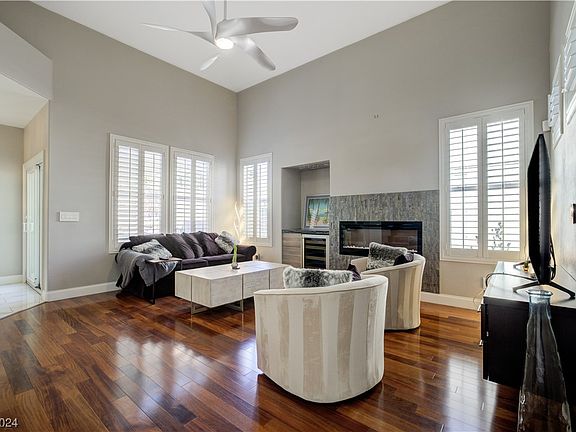 LOCATION LOCATION LOCATION!! This boutique community, Desert Bloom, is located in the heart of Summerlin. This home has been renovated with a modern flair. From upgraded light and electrical switches, to shutters, lighting fixtures, custom closets and media cabinet, designer paint, custom bar w/wine fridge, epoxy garage and extra storage cabinets to a backyard oasis. The front yard has recently been custom upgraded to desert landscaping. Hardwood floors both downstairs and upstairs. Granite and custom cabinetry in this roomy kitchen also has stainless steel appliances and porcelain tile. Really, too many upgrades to mention.