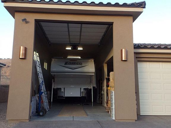 Need a lot of Garage Space ? We have the home for you. RV garage 14 ft wide x 36 ft deep - 10 x 12 Automatic Garage Door with your own sewer dump, 30 amp service in RV garage, Garage is insulated, drywalled, and painted with base boards, Water Softener & R/O System, Sink in the garage, BBQ and Island with small refrigerator, Propane plumbed to BBQ, Propane Fireplace in Living room, Granite Counter top throughout the home, Under mount sinks throughout the house, Built in Media shelving/niches in Living room, Ceiling Fans with lights in all Bedrooms and Living room, Tiled Walk-in Showers, Tile Flooring throughout the house, Covered Patio and Stained Stamped Concrete on Patio and Driveway - Pool/Spa wiring located in backyard in case you want to add a Pool or Spa.