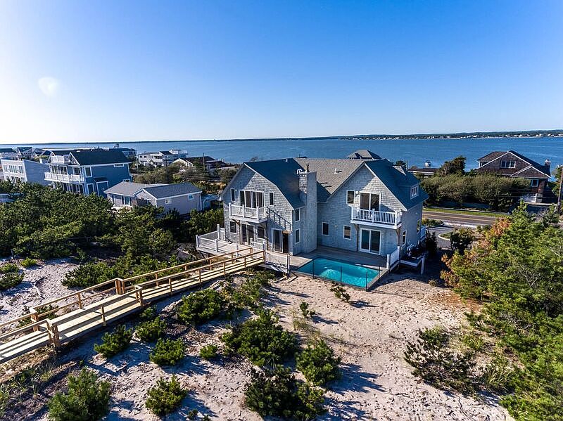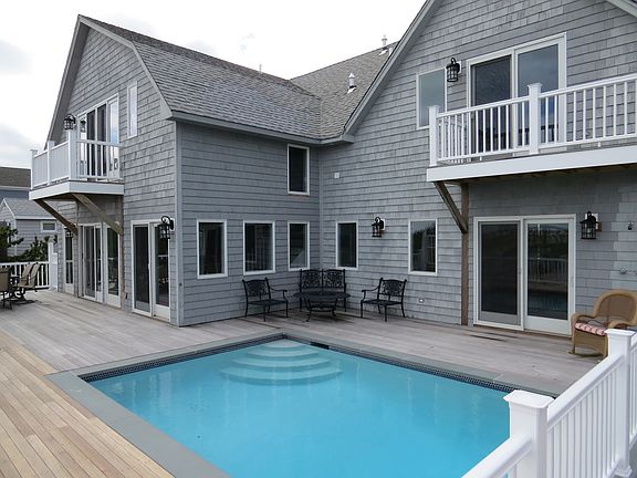 A shingled two story Post Modern overlooking the spectacular Atlantic Ocean. The open and spacious first floor features a new eat-in-kitchen with stainless steel appliances,oversized living room with fireplace, two bedrooms that share a bath and laundry room. Located on the second floor is the master bedroom and bath with its own private balcony, plus an additional bedroom with bath. There is also another room for a fifth bedroom or den. Complete with a new, oceanside heated Gunite swimming pool, 2 zone central air conditioning, new decking, stairs and railings, Anderson sliders & windows, hot & cold outdoor shower, private walkway to the beach and Right of Way to the bay. Call Michael to view this exclusively offered oceanfront home.