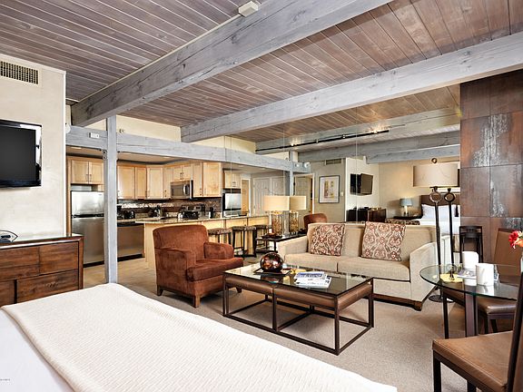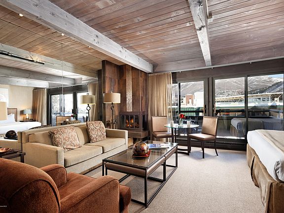 Enjoy this ideally located and beautifully remodeled Aspen Square studio, only 60-steps to the Silver Queen Gondola and only one block away from Aspen Art Museum! After a fun day on the mountain cozy up to the wood burning fireplace with warm porcelain metallic tile hearth and custom inlay accent. This completely upgraded fireside studio unit features high-end fixtures, new contemporary furnishings, maple cabinetry, and an upgraded u-shaped kitchen with solid slab granite countertops, stainless steel appliances and a custom tile backsplash. Step outside to your private balcony and take in the views of Red Mountain, Smuggler, and Hunter Creek Valley. This is Aspen's best location! Excellent Aspen Square amenities include: front desk, concierge, pool, hot tubs, fire pit, gym, courtyard and
