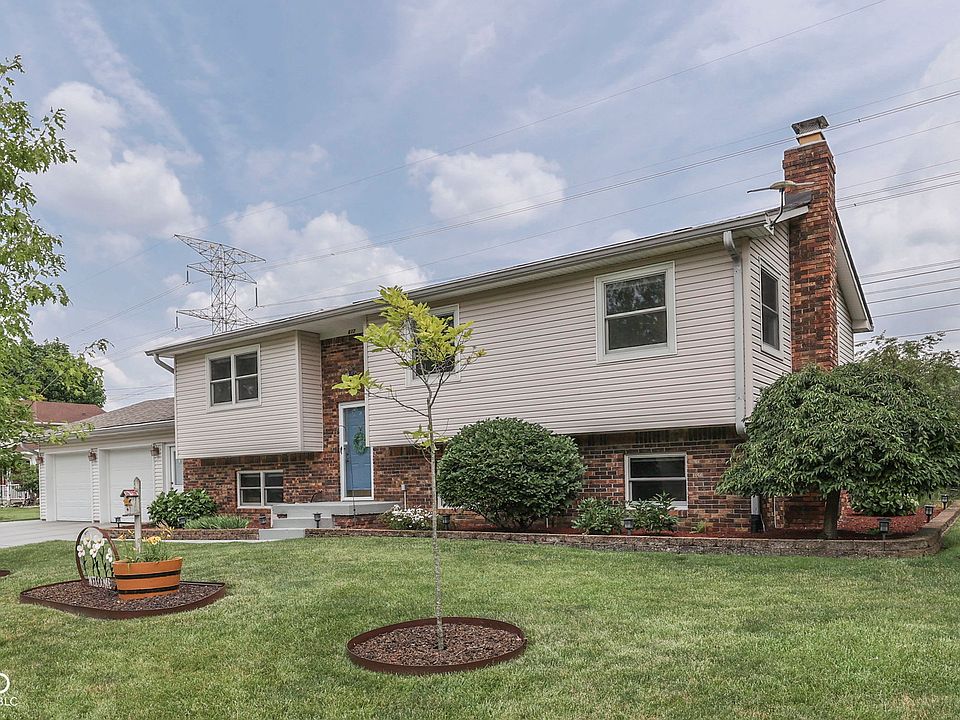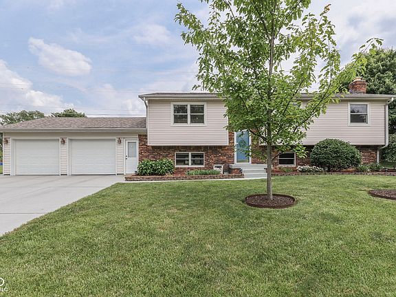 Meticulously maintained Center Grove 4 BR/3 BA Bi level home w/ No HOA & over 2300 sq ft(+/-), an awesome 4 Car Tandem garage, and beautiful landscaping, will impress you. Kitchen features SS appliances, subway tile backsplash, epoxy glossed CT's, breakfast bar, & refinished cabinets. New carpet in all upper level BR's. Primary BR has priv Bath. Living Room/Dining Room nice space for entertaining. Family Room Masonry FP w/ insert and blower fan shows off shiplap highlights. Lower level BR and lower BA w/ tiled walk in shower, perfect for guests or in law quarters. Den/library/office with built in desk. Washer/dryer in the laundry room stays. Heated Finished garage with storage bump out has epoxy flooring and tons of outlets for tools. Concrete patio with firepit and decorative retaining wall. Upper level deck overlooks the expanse behind the home. 2 storage sheds. HVAC '23, Roof '23, Water heater '18, Upper carpet '25, Battery back up sump '20, Renewal by Anderson windows 2012, Garage expansion '08. Garage fridge included. Don't miss this incredible home in desirable Whispering Trails neighborhood.