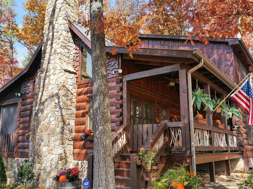 LUXURY CABIN home nestled in Farmer Estates, just outside Blue Ridge. This stunning cabin boasts extra details such as rough hewn logs, 2 stone fireplaces, cathedral ceilings, Mountain Laurel and California vineyard railings, remodeled baths and plantation shutters throughout. The kitchen has been upgraded with granite counters and newer appliances. Home has an abundance of outdoor living space with 3 porches and multiple sitting areas in the fenced in backyard. One may relax in front of the outdoor wood burning fireplace or while sitting in the jacuzzi. The 2 car garage was built in 2021 with 648 feet of living space above it. This upstairs guest-apartment is beautifully decorated with 2 beds, a sitting area, full bathroom and even a small kitchen; perfect for guests, mother-in-law or teenager. Apartment comes furnished excluding a few personal items. Parking area for your camper including a 30 amp outlet.