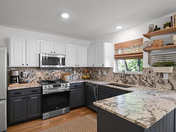 Welcome home to your CRAFTSMAN STYLE home with all of the updates! You will love the HARDWOOD FLOORS, MODERN BLACK HARDWARE & FIXTURES & white 6 panel doors throughout! The newly updated kitchen features white & Navy Contrast cabinets, BEAUTIFUL LEATHERED GRANITE TOPS, BACKSPLASH & LG suite of SS APPLIANCES! Comfortably work from home in your SPACIOUS OFFICE! There are CUSTOM BUILT INS & BLACK WAINSCOTING! The living room has H/W FLOORS, CUSTOM BUILT INS & a BAY WINDOW! There is main floor laundry & a DROP STATION! Head upstairs through your FRENCH DOORS & VAULTED OWNERS SUITE! The owner’s bathroom has LVP FLOORING, a DBL VANITY & sep tub & shower! Two additional bedrooms and an updated hall bath round out the 2nd level! The garage has a new floor & custom storage/shelving! Step out of the slider to your patio w/LG FORMAT PAVERS! Updates include: New countertops(2022), new roof(2022) new garage floor(2023), updated carpeting(2022), new LVP in UL bathrooms(2022), new water heater(2019).
