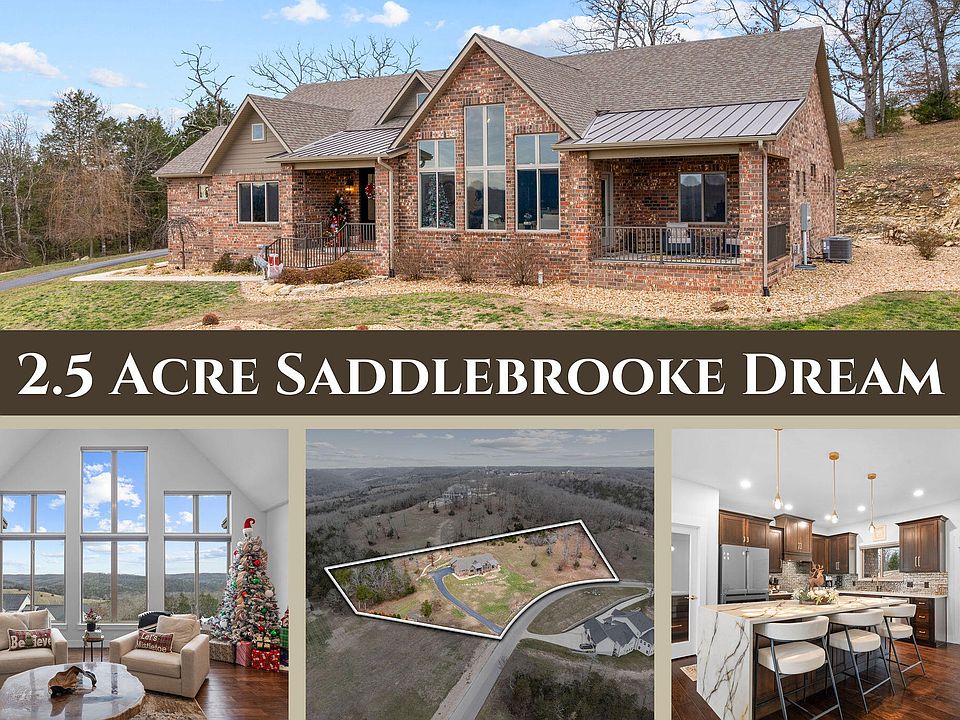 Welcome to an exceptional home offering refined luxury, privacy, and breathtaking views. Located in sought-after, upscale community of Saddlebrooke, this elegant all-brick home sits on a 2.5-acre double lot! Thoughtfully remodeled, this home features impressive upgrades including quartz countertops & backsplach, Bosch appliances, impressive light fixtures & electric fireplace & a polished foyer. The wall of windows showcases incredible sunsets and breathtaking views for miles, filling the home with natural light and creating a truly stunning living environment. There's even a bonus workout/flex room in the garage! The desirable one-level layout offers effortless living, while the covered front and back porches provide the perfect setting to relax. The back porch is prepped with electrical for a hot tub. Surrounded by nature with frequent sightings of deer, turkey, and other wildlife, enhancing the peaceful and private setting. Enjoy community amenities including pool, tennis, Clubhouse, 40 acre park, creek & walking trails! Ideally located with convenient access to Highway 65, this property offers a rare opportunity to enjoy refined luxury, privacy, and convenience!
