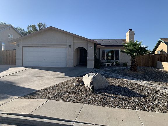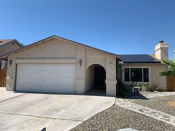 Paid Solar means you enjoy no energy bill from Edison!!! Located close to the back gate of the base. The low maintenance, low water, xeriscaped front yard has all plants on sprinklers with the timer conveniently located close in the garage for adjustments. Walking in to the house you find nice porcelain tile floor in the living room, family room, dining room, and kitchen. Kitchen has added pantry cabinet for extra storage. The living room is complete with TV and sound which stays with the house. The kitchen, dining, and family room are conveniently next to the back patio for gatherings and entertaining. Ethernet jacks in every room as well as wiring in the hall closet for networking. Fresh paint throughout the house and new carpet in the hall and bedrooms. Refreshed finish on the cabinets in both bathrooms. Bathroom fan has a timer for convenience and energy savings. Plenty of room in the backyard for play and entertaining or a pet plus a gate for easy access for desert walks. The back yard also has a large garden box and pull-up bars. The extra large swamp cooler is only about three years old, set up with barometric damper for easy switching from heat and cooling.