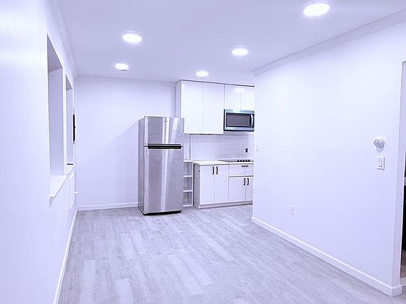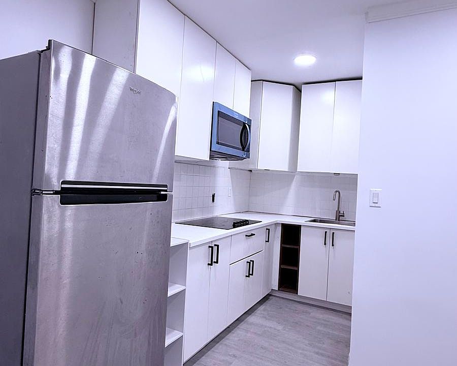 New microwaveElectric countertop stoveImproved lightingAmple cabinet spaceFreshly painted wallsNew flooring