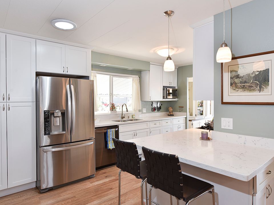 Turn Key Condition! Fabulous remodeled home with new floors, updated kitchen with new cabinets & quartz counters, master bath with new tiled shower stall, Living & dining area with vaulted ceiling, family room, two bedrooms, two baths. New roof. Covered sun porch and outdoor entertaining area. Great location near the park green in Chateau Calistoga 55+ Park close to downtown Calistoga. Park offers a community clubhouse, pool & group activities.