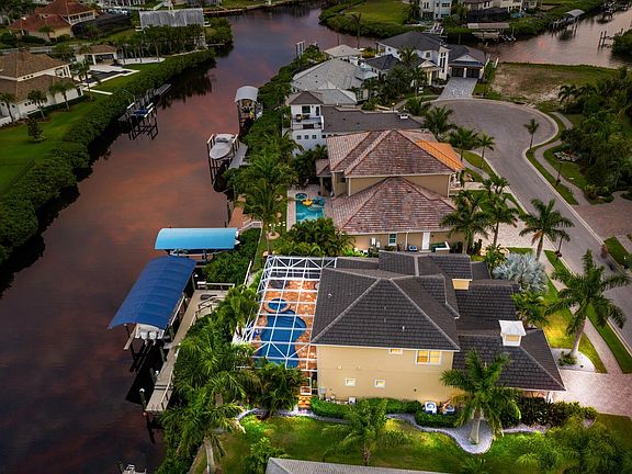 This custom-built, island-inspired home is located in a premier gated boating community on a prime lot that captures the true essence of Florida living. Upon entering you will be mesmerized by the coastal inspired interior that blends high-end design with relaxed luxury living. Open living spaces bathed in natural light from expansive hurricane impact windows/doors will bridge the senses between indoors & outdoors. Create culinary masterpieces from the chef's kitchen that features a commercial grade 6-burner gas stove, an oversized island which opens to a casual dining space, richly appointed quartz counters, SS appliances, a walk-in pantry & more. Wake up to glistening sunlight on the water in your private Owner's Retreat complete with 2 walk-in closets, a master bath w/luxurious counters & floors, separated dual sinks, & walk-in shower with multiple jets. The home features a water pressure booster for the ultimate shower experience. Upstairs you will find 3 more bedrooms, 2 full baths, and a large bonus room. Features include a whole house generator, hurricane impact windows & doors, tankless water heater, infinity air purifier, radiant barrier roof shield, & more. Outdoor living is at its best with a full outdoor kitchen, a stunning pool & spa surrounded by a beautiful travertine terrace deck. The extended dock includes a 28,000lb. covered lift for your boating pleasure plus a step down section to access jet skis. Situated on a deep saltwater canal, direct open water will lead you directly to the Gulf of Mexico & beyond. Close to I-75, shopping, restaurants, beaches, 3 major airports and more.
