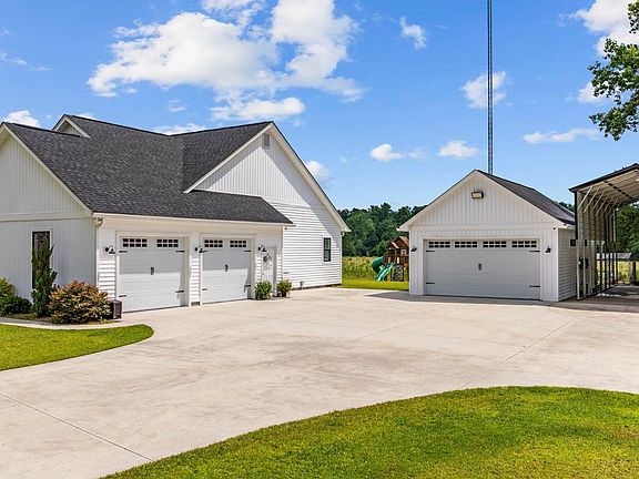 Situated on a prime corner lot, this beautiful farmhouse-style home epitomizes country charm and modern convenience. The property is highlighted by a spacious open floor plan, perfect for seamless living and entertaining. The inviting exterior features classic white siding, black windows, and a welcoming front porch, ideal for enjoying peaceful countryside views. Step inside to find a bright, airy living space filled with natural light from large windows that frame scenic outdoor vistas. The living room, anchored by a cozy fireplace, flows effortlessly into the kitchen. This kitchen includes a large center island, a gas stove, and plenty of cabinetry, making it perfect for both everyday meals and festive gatherings. Adjacent to the kitchen, the dining area offers a warm, communal space for family dinners. The master suite is a private retreat, complete with a luxurious en-suite bathroom featuring a stunning walk-in shower. Additional bedrooms are spacious and flexible, suited for guests, children, or home office needs. Outside, the property includes a big attached garage with ample space for vehicles and storage. Additionally, a detached garage offers extra room for hobbies, a workshop, or additional storage. The expansive yard is perfect for gardening, outdoor activities, or simply enjoying the serene environment. This farmhouse-style home blends rustic charm with modern amenities, providing a perfect country living experience.