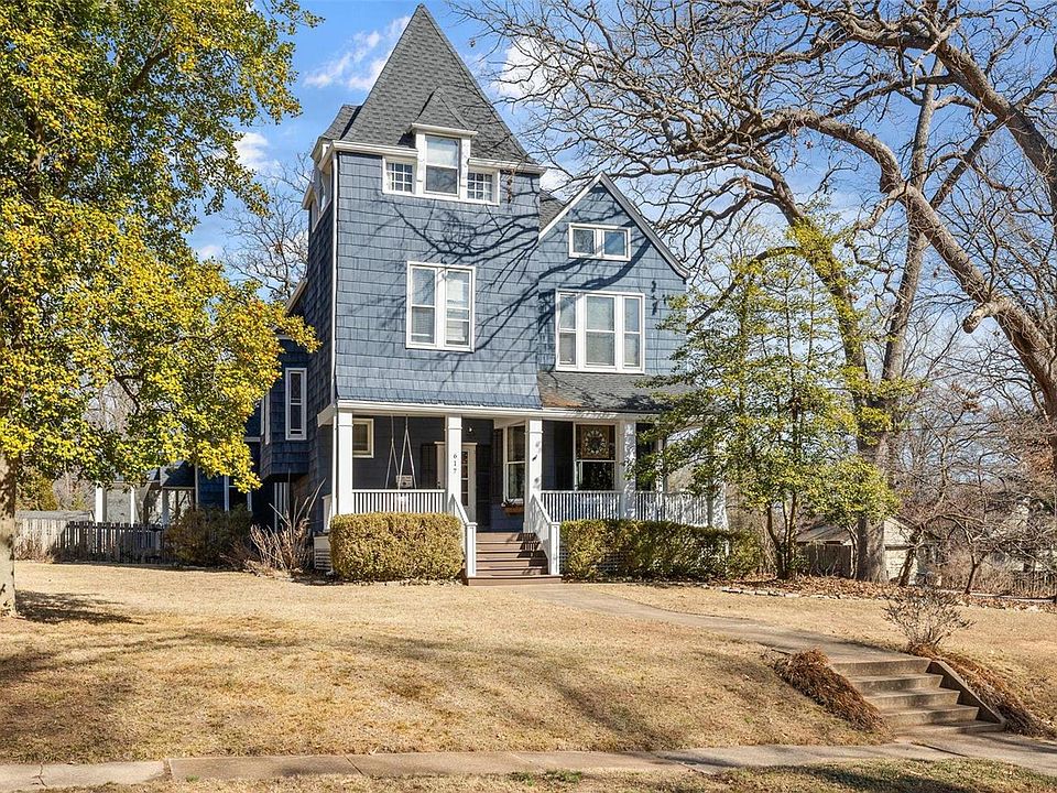 Live your best life in this 5 bed, 2.5 bath Queen Anne style beauty with unique turret. From your first step onto the covered porch and into the foyer with turned, white-spindled staircase, you'll begin to envision hosting family and friends in this remarkable home that boasts over 4,000 sq ft of living space. To the right is the living room, with bayed wall of windows, anchored by a fireplace, and the perfect scenario for one big gathering space or seating vignettes for the feel of a more intimate setting. The kitchen has double-stacked, cherry cabinets and a big, central island open to the hearth room with fireplace. The dining room (currently used as family room) has French doors to the screened porch that leads to the pool, deck, and level, fenced yard that is just shy of a half-acre. 3 beds and 2 baths, including the glam primary suite, plus the laundry room are on the 2nd level. The walk-up 3rd floor houses 2 more bedrooms and a nook that makes a fantastic office or play space.