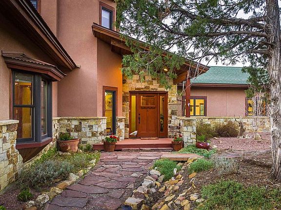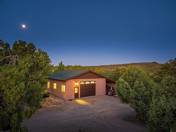 Spectacular panoramic views of the La Plata Mountains, Black Ridge, and Lake Nighthorse with much privacy, close proximity to down-town Durango, hospitals, Lake Nighthorse, and airport from this 4979 square feet custom home built in 2008 heated by natural gas. There is no HOA. This one-of-a kind, beautifully renovated, architecturally-pleasing residence features 4 bedrooms, 5 bathrooms, plus 30’x35’ workshop sitting on a 53-acre lot. The stand-alone workshop can house a Kabota tractor plus a second vehicle, and there is a carport suitable for storing an RV. The house boasts of extensive storage space throughout, in-floor heat, Atmos Energy natural gas, double-paned windows, beautifully laid travertine tile, Hunter Douglas window shades, ample wall space to exhibit your art collection, and space for a future, tri-level elevator if desired. A swamp cooler keeps the home temperature cool in the summer. The covered porch leads into expansive foyer with beautiful tongue and groove, vaulted ceilings, and spiral staircase leads you up to a large, stunning art studio. The voluminous interior living space boasts vaulted T&G ceilings and large windows that allow lots of natural light that beautifully frame the surrounding vistas, sunrises, and sunsets. Great for entertaining large groups of people both indoors and out. The living room includes a soapstone wood-burning stove, a gas fireplace, and a computer nook. Additionally, there is a wet bar centrally located and ideal for any gathering. Plus, there is a full guest bedroom suite off of the entryway. The separate dining room leads you through an arch to a large kitchen with cooktop island with bar seating and a large walk-in pantry. This presents an ideal setting for gatherings and preparing meals for family and friends. Off the dining room is a covered deck with a wooden ceiling which provides a delightful space with beautiful views. The deck opens to a private, 8-person hot tub and a stone fire pit. This home offers two master suites. The main floor master suite includes a fireplace, a unique copper tub, walk-in shower, water closet, and walk-in closet. The over-sized, two-car garage includes a separate garage door for bikes or snowmobiles and shelving. The laundry room adjacent to the garage includes a washer and dryer, custom cabinetry, and a large stainless-steel utility sink. A mudroom is accessible from the front door, garage, and laundry room. The upper level includes the second spacious master suite with breathless views of the La Platas and Lake Nighthorse and includes his and hers walk-in closets with custom design shelving, a spacious no-door walk-in shower, and a stand-alone Jacuzzi tub. The large art studio offers spectacular views of the La Plata Mountains with a balcony. It could easily be converted to a fifth bedroom, home office, hobby room, nursery, etc. The finished lower level is complete with two bedrooms, two bathrooms, a living area, workout space, a storage room with custom shelving, understairs storage, and a walk-out. This space can easily be converted into a two-bedroom apartment with its stub out for a kitchen. The front of the house was recently landscaped with pinon, maple, and aspen trees, sage bushes, and numerous flowers, complete with a sprinkler and drip system. The backyard also includes a variety of flowers plus a drip system that extends to potted plants and hanging baskets. The driveway is graded with a concrete/asphalt mixture.The roof was replaced in 2014. A highlight of this 53-acre estate is its private playground with established trails that could be used for snowmobiling, cross country skiing, snow shoeing, hiking, sledding, and horseback riding. Yes, this property would be great for horses as well! The trails take you through clusters of trees, down into washes, onto flat meadows, that can take up to two hours to complete, all with spectacular views of the La Plata Mountains and the surrounding area. This is truly a spectacular property.