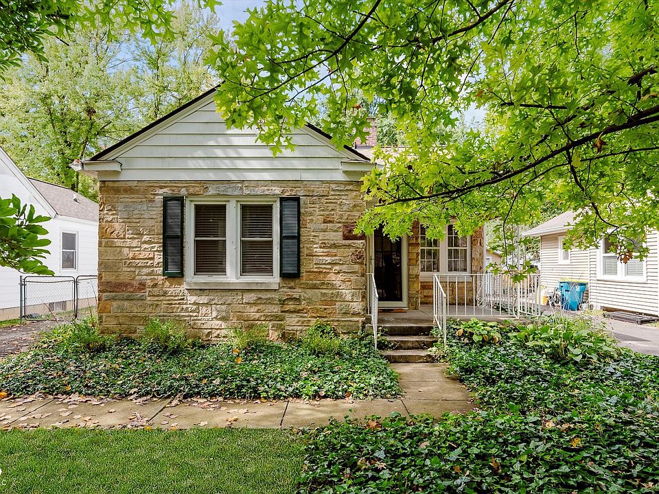 Charming bungalow in the Norwaldo neighborhood in Broad Ripple, offering a blend of character and function. This 2-bedroom, 1-bath home features hardwood flooring throughout the living and dining areas, highlighted by a masonry fireplace and arched walkways. Updates include newer roof, HVAC, water heater, and windows. The updated kitchen includes white cabinetry, dark countertops, and recessed lighting, along with a full suite of appliances. The bathroom has been refreshed with an easy-entry tiled shower, vanity, and wainscoted wall detailing. Both bedrooms offer natural light and ceiling fans for comfort. The unfinished basement provides laundry space, a utility sink, and ample storage. Outside, enjoy a covered front porch, partially fenced yard, and detached one-car garage with additional parking options. Mature trees add shade and curb appeal to the 0.13-acre lot. Conveniently located near local dining, shopping, and parks, this home provides easy access to all that Washington Township and surrounding areas have to offer.