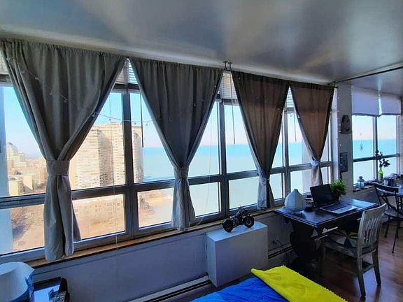 Highly sought after unit with end to end wall windows providing full breathtaking and un-obstructed views of Lake Michigan. This spectacular jumbo studio in the hot Edgewater Beach district has an open concept style with living /sleeping area and separate dining /work area nook. Efficient kitchen with return island and all white bathroom. Berger Park is right next door and you can walk to three beaches for fun and sun. No car needed. Welcome to your best life This building features: 24 - hour doorman, 24 - hour professional management on site plus a 24-hour building engineer and maintenance. Building amenities include: laundry room, state of the art fitness center, party room with 360 degree view of the lake and city, rooftop deck. Wait list for onsite parking available, for additional cost. Rent includes : storage; in-unit heat, water, cable, building and lawn maintenance. Express bus outside front door. Walking within blocks to CTA red line. Walk to Loyola plus a great selection of shopping including Aldi and Whole Foods.