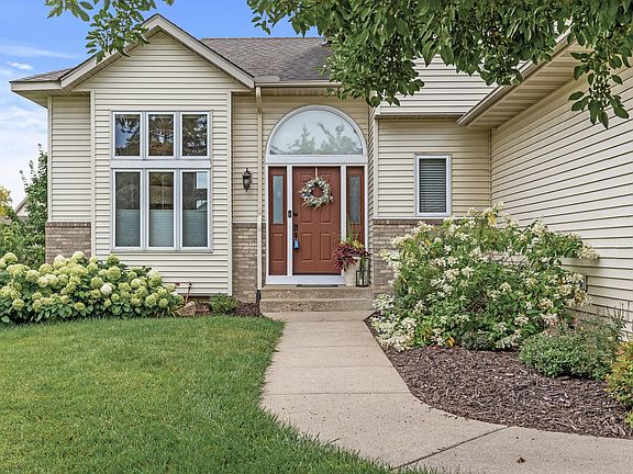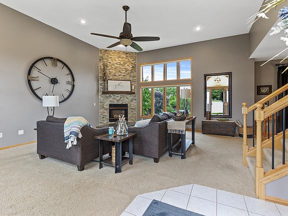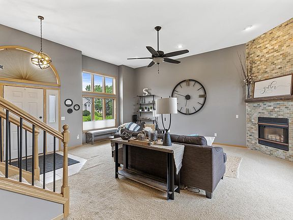 Must-see walkout on a scenic pond with breathtaking views! This stunning modified 2-story home features 5 bedrooms and 4 baths, perfect for modern living. The main level boasts a versatile bedroom, 3/4 bath, convenient laundry room, and a beautifully designed kitchen with a center island and stainless steel appliances. The large great room, with its cozy gas fireplace, is perfect for entertaining. Step out onto the expansive deck and enjoy the serene backyard pond, ideal for relaxation.