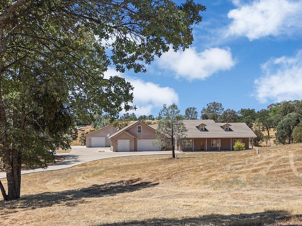 Spacious Country Home nestled on 3+ acres in Valley Springs. The home offers incredible potential with a functional layout and room to grow. The main level includes a formal dining room, living room and a family room and kitchen combo featuring an island, double wall oven, gas cooktop, refrigerator, breakfast bar and walk-in pantry. All bedrooms are located downstairs including a primary suite with double doors that lead to the backyard patio. Upstairs is an office or den that could serve as a fourth bedroom. Enjoy the oversized laundry room with added storage. The home includes a 3-car attached garage and a detached 4-car garage (35x39ft), along with an extended concrete driveway and expansive hardscape for RV and guest parking. Covered front and rear patios provide great outdoor living spaces. A wood stove adds charm and warmth. Located minutes from town amenities and New Hogan Lake. With space, function and flexibility, this home is a rare opportunity in the foothills!