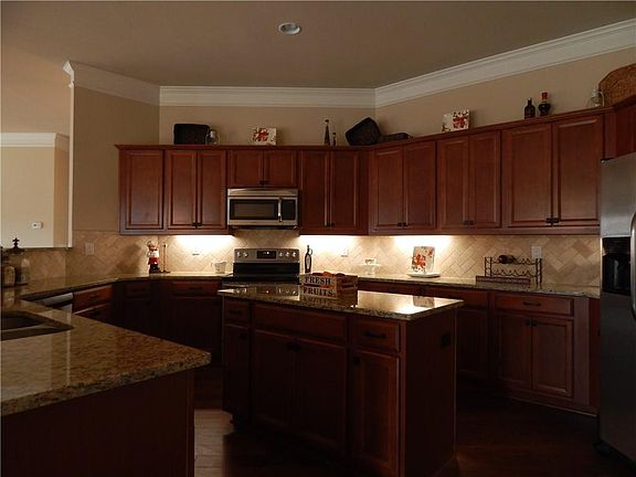 - Kitchen Features: Breakfast Bar, Cabinets Stain, Eat-in Kitchen, View to Family Room, Kitchen Island, Pantry Walk-In, Solid Surface Counters