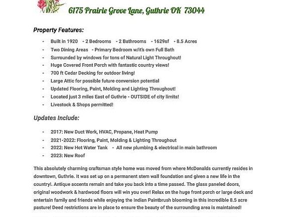 This absolutely charming craftsman style home was moved from where McDonalds currently resides in downtown, Guthrie. It was set up on a permanent stem wall foundation and given a new life in the country! TONS OF ADDITIONAL ATTIC SPACE/HEIGHT FOR ADDED BEDROOM/BONUS ROOM POTENTIAL! Antique accents remain & take you back into a time passed. The glass paneled doors, original woodwork & hardwood floors will win you over! Relax on the huge front porch or large deck & entertain family and friends while enjoying the Indian Paintbrush blooming in this incredible 8.5 acre pasture! Deed restrictions are in place to ensure the beauty of the surrounding area is maintained! Home offers 2 large bedrooms, 2 full baths (One is on-suite of Primary Bedroom), huge formal dining, breakfast room, mud room and large kitchen! Each room is surrounded by tons of large windows bringing in SO much natural light! The original woodwork, doors and hardwood floors are unbelievable! This is the real deal. If you are looking for your place in the country, this is a MUST SEE!