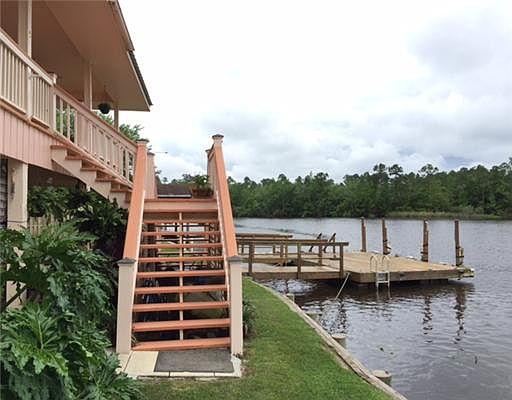Double (fenced)lot with 150ft on the Jourdan River-just across from sandbar.Wrap around porch,dwnstrs wet bar,storage room & bath.Floating boat & jet ski dock.Entertain, fish,boat,swim or relax!Easy NOLA or Stennis commute.Open living/ dining.Community pool.Your perfect get away or live every day!