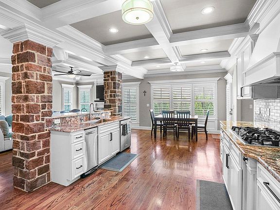 Inside, the home boasts beautiful hardwood floors, extensive trimwork, and crown molding throughout. The main level features a master suite with a spa-like tile bath, a gourmet kitchen with designer granite counters and custom cabinetry, additional bedroom & full bath, and a fireside keeping room. As you go upstairs, you are greeted by spacious bedrooms, including a bonus room that can serve as a private suite with its own bath and ample closet space.