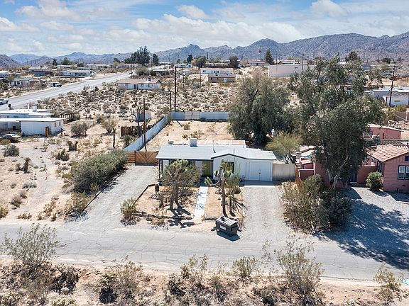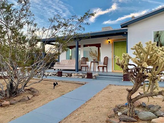 Beautifully remodeled mid-century home in south JT Village with views of mountains and walking distance to nearby hiking trails, shops, and eateries. Privacy fence. Spacious living room. New windows, floors, lighting, and curtains throughout. Two roomy bedrooms. New AC/heating mini split systems. Kitchen with new counters, cabinets, sink, stove, microwave and refrigerator. Bathroom with new toilet, vanity, sink, glass door shower and tile. Two shaded patios. Extended patio area with gravel. Private hot tub spa. Backyard fire pit. Ready for entertaining. The Jt Village is possibly the hottest vacation rental neighborhood in the Morongo Basin. With very desirable proximity to cafes, restaurants, the saloon and the JT Monument main entrance. Don't Wait! - Call Now!