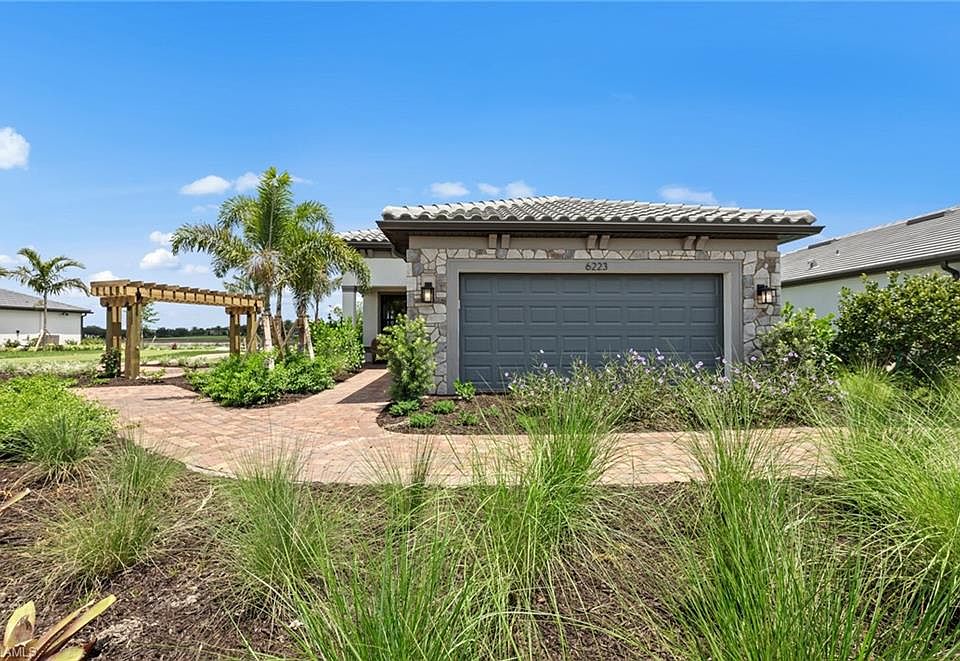Move to Del Webb Naples! This Contour home features an enclosed flex room, 4' garage extension, beautiful built-in kitchen configuration, dropped soffit at owner's suite, 8' doors, upgraded base board/casing, epoxy finish in the garage, tile flooring throughout & so much more! This home is situated on an ideal lot with NW facing lanai with lake views! Room for pool to be added after closing.