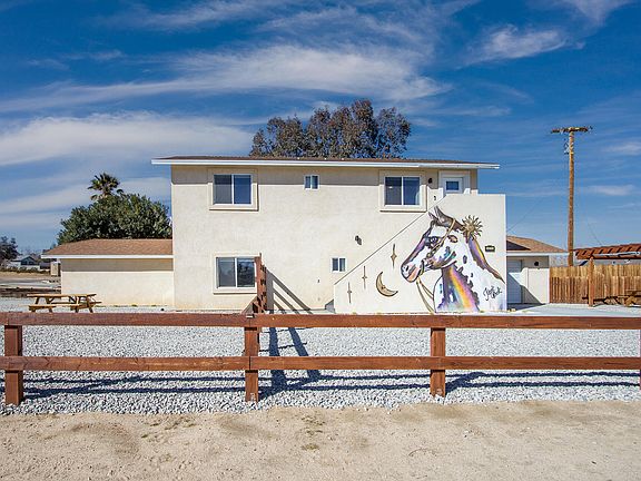 Substantially remodeled duplex in the heart of Joshua Tree Village can't be beat! Short term Airbnb rental permit on property. Each turnkey unit is comprised of 1,120 square feet, 2 bedrooms and 2 full bathrooms and separate, attached 1 car garages. The downstairs unit boasts vinyl flooring through out and modern finishes. The kitchen features white shaker style cabinets, quartz counter tops, stainless steel appliances, and provides access to the private indoor laundry area. The full guest bathroom has a single sink vanity and a walk in shower with glass doors. The primary bedroom also features vinyl flooring, ceiling fan and an on suite bathroom with a single sink vanity with extra counter space and walk in shower. The upstairs unit mimics the floor flan of the downstairs unit with similar finishes. The large yard features tow separate picnic areas, one with a pergola, low maintenance gravel and spectacular views. The close proximity to all of the great restaurants, boutiques, farmers market and main entrance to Joshua Tree National Park is a great location for a short term rental.