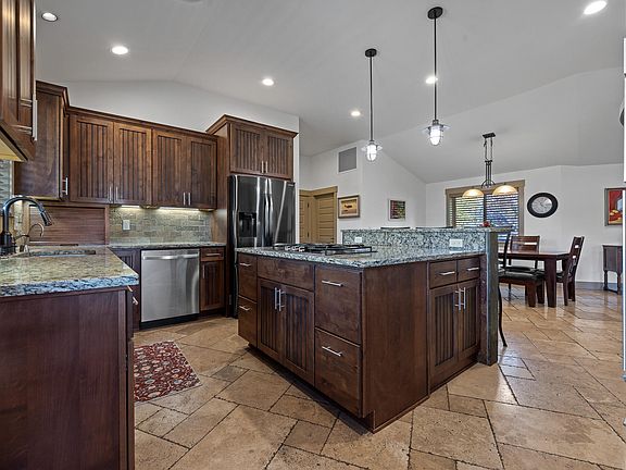 - Breakfast Bar, Ceiling Fan(s), Double Vanity, Enclosed Toilet(s), Granite Counters, Kitchen Island, Linen Closet, Pantry, Primary Downstairs, Shower/Tub Combo, Soaking Tub, Stone Counters, Tile Shower, Vaulted Ceiling(s), Walk-In Closet(s)