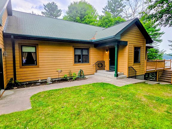 Stunning Lake views from this 3 bedroom, 2 full bath chalet style home. Large living room, dining room combination. Deck made up of Trek decking off the living room. 2 Bedrooms and laundry on the main level for convenience. Large deck leads to gazebo with an astounding lake view. Fully finished walk out basement includes a third bedroom, full bath, office and immense storage space. Concrete steps to the waters edge with substantial railing for safety. Brand new dock with a view all the way up the lake. Shared driveway with 2 neighboring cabins. Oversize 2 car garage with plenty of room for vehicles and lake toys. Secluded and Private makes this the perfect Lakefront Cabin or Home on nearly an acre of land.