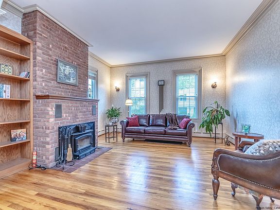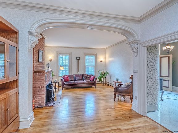 Set on a hill in the quiet Hamlet of Sleightsburgh you will find this beautifully maintained Victorian with gorgeous views of the Hudson River. The gracious entry foyer, with curved plaster walls, leads to the main living area featuring plaster archways, corbels and finials, 10 foot ceilings, gleaming hardwood floors, a cozy living room with brick fireplace and wood burning stove insert, windowed alcove in the dining room and large home office with built-in shelves and storage cabinets. A curved staircase leads to the second level with the primary bedroom, updated full bath. and guest bedroom with a reading nook with a view. The bright kitchen, with new wood cabinets and quartz countertops. opens to the dining area and family room. Take in the river view through the large sliding glass doors in the family room or while dining or sipping a glass of wine on the wrap-around deck. BBQ and relax on the private, rear deck with pergola covering the six-person hot tub. The walk-out, lower level is finished and offers the third bedroom, with fireplace, rec room, full bath with Jacuzzi soaking tub and glass-door shower, mud/craft room, laundry room and access to the garage. Bonus of a separate, 18 x 20, workshop/studio building with loft space and electric. Perfect for an artist, craftsman or possible guest house. The new owner will appreciate the lovely landscaping with flowering trees and perennials, Wisteria covered patio, retaining walls, level grassy areas for playing and a small fenced-in vegetable garden. Two blacktopped driveways allow access to the heated, three-car, drive-under garage. This home is beautiful and full of natural light and truly must be seen to be appreciated! Sleightsburgh Park is a short walk and offers a public boat launch for access to the river and trails through a wooded peninsula extending to the river. This location is convenient to the bus route, train stations in Poughkeepsie and Rhinebeck, and all major commuter routes. Just a few minutes drive to Downtown Kingston restaurants, galleries and shops, as well as Midtown and Uptown Kingston.