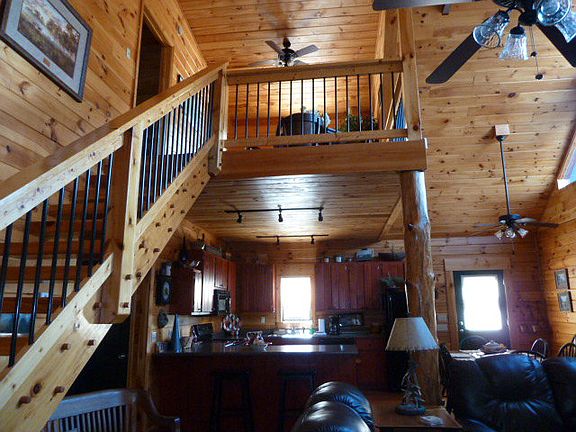 Amazing view in community of beautiful high end homes with river access. This real log 3/2 mtn top home is also a vacation rental. Soaring cathedral ceiling, fplc, all wood floors, loft sitting area,covered wrap porch,fully furnished, beautifully decorated for rental. Currently on VRBO and Homeaway. Offering $8,000 ext. stain allowance w/full price offer. Lease/option. Seller finance. Must see