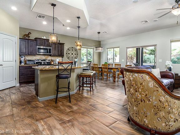 Open concept living and the backyard is large enough for a pool - Huge BBQ Island for entertaining - Upgraded front door - Granite Countertops in Kitchen and both bathrooms - Ceiling Fans with lights in all Bedrooms and Living room - Vaulted ceilings - Surround Sound - Covered Patio and Stained Stamped Concrete on Patio and Driveway - Tiled Walk-in Showers - Tile and Carpet Flooring - Painted accent walls - Large side yard - The house is being sold with almost all the furniture and kitchen supplies. Home has been used as a vacation rental but could be a perfect home or used as a rental home.