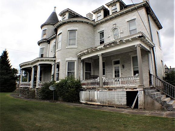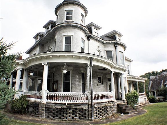 Turn of the Century mansion on millionaire row in Waynesburg PA. Own a one-of-a kind piece of history. With 3600 sq ft, 40 windows (mostly curved or stained glass), large wrap around porch with mosaic tile floor, multiple gables, high ceilings, original woodwork, hardwood floors, working pocket doors, fireplaces with amazing woodwork and colored ceramic tile hearth and mantels, crystal chandelier and the entire house wrapped in Granite (Belgium brick). Also includes a 2-car garage, Koi pond, grape vines. Used as a bed and breakfast at one time and as a home it is quite the conversation house; it has a long very interesting history. Includes a 7 room 1300 sq ft carriage-house.