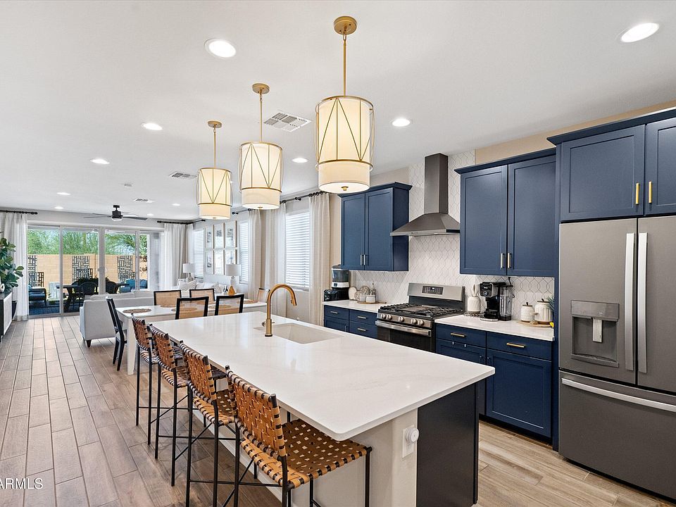 Welcome to the former model home in the gated Seasons at Dobbins community where luxury design, high-end upgrades, and peaceful desert living come together seamlessly. This 4-bedroom, 3-bathroom home plus teen room/den is a showcase of thoughtful design and modern elegance. Every detail was curated with model-home precision, from the warm two-tone paint palette to the custom cabinetry in rich navy with brushed gold hardware and stunning Eternal Calacatta Gold quartz countertops that elevate the kitchen's style and function.