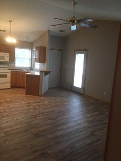 Great newer duplex with vaulted ceilings in the open kitchen/living room. LVP flooring throughout the entire home. Kitchen includes fridge with ice maker, glass-top stove, new dishwasher and new microwave. Living room and all three bedrooms have ceiling fans. Large closets in all three bedrooms. Brand new washer and dryer included. One-car garage has a garage door opener. Quiet patio is perfect for grilling out. Quiet, safe neighborhood is close to a middle school. Available for one-year lease, or ask about other lease terms. Lawn mowing available for $15.00 per month. No smoking, please. Great newer home with vaulted ceilings, ceiling fans, nice patio and yard, and brand new dishwasher, microwave and washer/dryer. LVP flooring and fresh paint throughout the entire home. Tenant responsible for natural gas, electricity, water, and trash service. Lawn care available for $15 per month, or tenant can do it themselves.