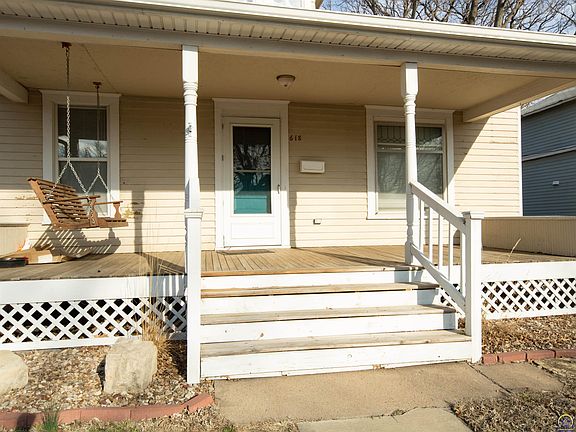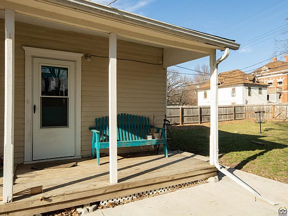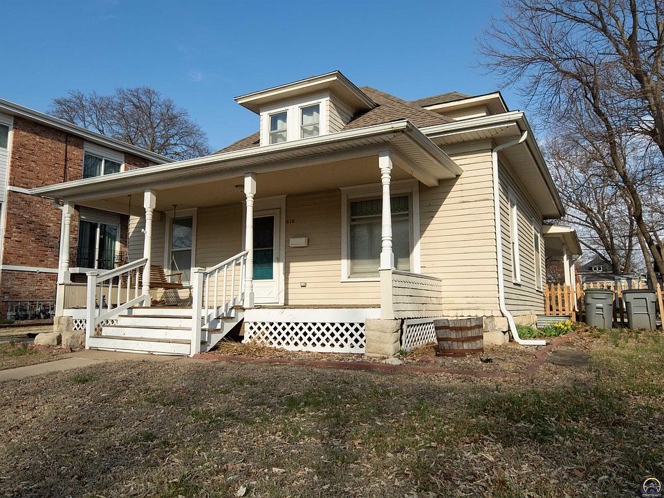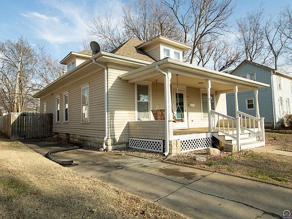 Downtown, Emporia State University, this home would make an excellent extended stay, college home or residence! Charming front porch (porch swing does not stay), hardwood floors, formal dining. Charming! Updates include a remodeled kitchen and both bathrooms. Kitchen appliances stay with the home. On suite primary bedroom. 2 bedrooms on the main floor, upstairs finished attic for a 3rd. Main floor laundry. Side porch off the kitchen. Fenced in back yard with a storage shed. Off street parking in the front. Let'd check this one out!