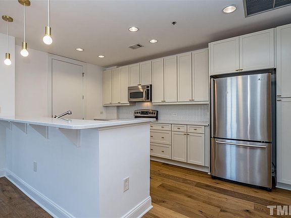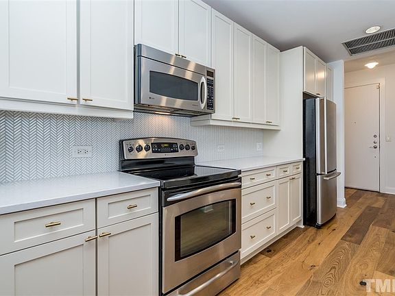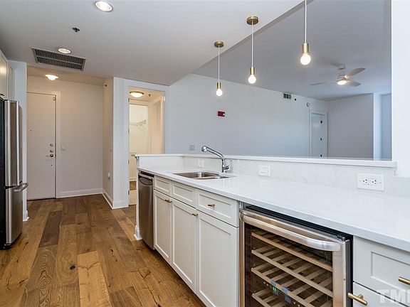 Paramount Luxury, Style, & Convenience! Check out this large 2 bdrm fully renovated NW corner unit. Wine & Dine on large balcony. Brand new floors & cabinets & counters. Quartz counters & SS appliances inc Wine Cooler! Fresh paint complements this light, bright, easy living, lock it & leave it unit in prime DT Raleigh location. Drop several floors and enjoy club house facilities including indoor / outdoor kitchen, pool table, gym, pool & patio. Storage unit & two deeded covered parking spaces included!