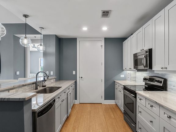 Live in the heart of it all, but above the hustle & bustle in this Executive 9th Floor, west-facing, condo w/updated luxury features. Enter to an open floor plan w/engineered hardwoods & high ceilings thruout. This light filled home features an upgraded kitchen, 2 primary suites w/split bedroom plan, new built-in wine/beer bar, patio w/dual access, new HVAC (2021), fresh paint, updated fixtures, 2 parking spaces, storage unit & all the amenities that the sought after Paramount has to offer! The chef's kitchen fts new quartzite counters, refinished cabinets, custom backsplash, stainless steel appliances, under cabinet lighting & lots of peninsula seating which opens up to an oversized living room w/9.5+ft ceilings, space for a dining room table, a built-in wine/beer bar & access to the patio. The primary bedroom is sizable w/a wall of windows & access to the patio, the ensuite bathroom fts tile floors, double vanity, walk-in tile shower & huge walk-in closet. The other primary suite option is also sizable w/good natural light, ensuite bathroom & huge walk-in closet. Full size washer & dryer and refrigerator convey.