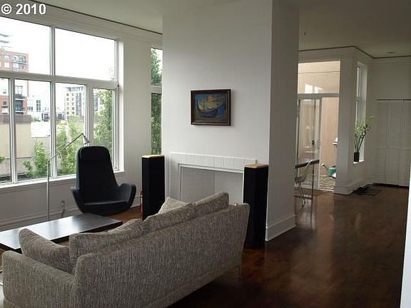 Great top floor corner unit with many windows & lots of light. Open contemporary floor plan. Crown moldings, wainscoting, wood burning fireplace, Maple floors, skylights add to this units appeal. Den w/built-in desk, shelves and privacy doors for overnight guests. Master suite. Large patio with views & secured parking. In the heart of the Pearl near shopping & restaurants.