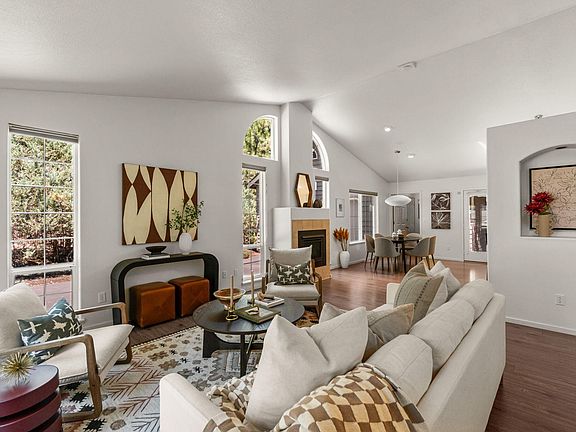 vaulted ceilings and skylights, and a cozy gas fireplace warms the space in the winter months. The open