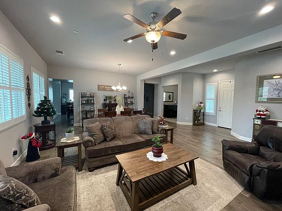 BACK ON the Market - NO FAULT OF THE HOME -This exquisite Woodside Spanish Oaks home sits on a picturesque 1/3 of an acre. 3/3 -Split Floor Plan- Great Room, Family Room with Fireplace , Office, Media area , every carpeted bedroom offers walk -in closets. This Classic Style high end home Boasts rich Wood look Tile flooring throughout. RV parking. Extra Concrete for abundant Parking, Custom Decorative Fencing with Front Gated Courtyard for privacy. Split 3 Car Garage. 2 are Extra long, Beautiful Custom Wooden Gates, Solar - buyer to assume lease, Beautiful Pool w/Gorgeous Cascading Spa and Built in Fire Pit for your Enjoyment, Separate HE & SHE SHEDs! are just the exterior beginnings!! This immaculate home Boasts almost $100K of Luxurious Builder Upgrades throughout. Entertain in style in your Gorgeous Chef's Kitchen offering plenty of Granite Counter Space and under Cupboard Lighting, Stainless Steel Appliances, a huge full functioning Granite Kitchen Island and Bar. Beautiful Custom Plantation shutters are throughout this spacious Home . The high Ceilings offer fans throughout. All bedrooms are fully Carpeted and have Convenient Walk-in Closets. Relax in the Master Suite with your own Spa-like Bathroom and Gorgeous EX-LARGE Walk -in Shower with Dual Heads. The Master sitting area leads directly out to the Stunning Backyard Amenities and Lovely Covered Patio for Entertaining Friends & Family. Pull up a Lounge, Sit back , Relax and Enjoy the Views of your Own Oasis and the Newly Snow capped Sierra Nevada Mountain Range! This Elegant home will bring your living to a new level of enjoyment!