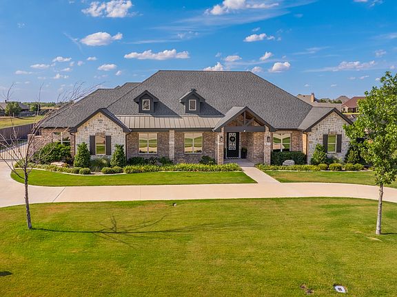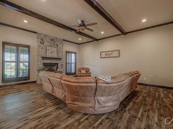 Welcome to your dream home—a stunning 5-bedroom, 4 full and 1 half bath executive retreat designed with elegance, functionality, and comfort in mind. Inside, the thoughtful floorplan features an office with glass doors and a media room with a built-in entertainment center that can easily serve as a 6th bedroom. Wood-like tile flooring flows throughout, creating a warm yet low-maintenance feel. The chef’s kitchen is the heart of the home with dual islands, induction cooktop, oven and convection oven, a built-in Frigidaire Professional fridge and freezer, plus a butler’s pantry with built-in wine rack and an oversized walk-in pantry. The living room showcases a cozy propane fireplace, wood-beamed ceiling, and plantation shutters for added style and privacy. Two guest suites feature private ensuite baths—one with direct backyard access. The primary suite is a private retreat with a brick accent wall, wood beams, private patio access, and a spa-like ensuite complete with soaking tub, dual vanities, walk-in shower with stone accents, and a massive walk-in closet with built-in dressers and window seat storage. Outdoor living is nothing short of spectacular. The covered patio features automatic shades, a propane fireplace, and water and gas plumbing for an outdoor bar. A saltwater pool with waterfall, tanning ledge, and secure fencing sets the stage for endless relaxation. A brand-new 1,200 sq ft flex building offers even more versatility with a half bath, plumbing for a kitchenette, walk-in closet, laundry hookups, and a 2-car garage—perfect for a guest house, gym, or studio. Additional highlights include a new roof, ice machine, and three 2-car garages with storage closets. This estate blends luxury, practicality, and endless flexibility—making it the ultimate forever home.