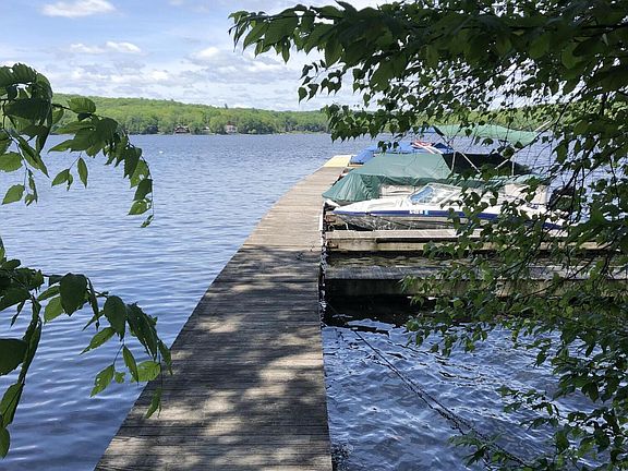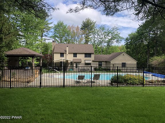 Lake Wallenpaupack DOCK SLIP, private salt water in ground POOL, large 30x32 GARAGE to store your boats and toys! This immaculate home is situated on 3.12 private acres in desirable village of Paupack/Palmyra township. Three BR/2.5 BA, large kitchen with quartz countertops opens to dining area. New vinyl siding (2018) and new roof, (2020) Hard wired generator/AC. Primary bedroom with bath suite. Exceptional grounds with mature woods retaining a park like setting. Head to the lake for boating or stay home, and enjoy your private pool and Tiki Bar!, Beds Description: 2+BED 2nd, Baths: 1/2 Bath Lev 1, Baths: 2 Bath Lev 2, Eating Area: Modern KT