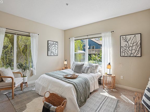 Beautiful top-floor condo in coveted John's Landing neighborhood with bright natural light and spectacular year-round views of Mt. Hood! On the lower level, you have both bedrooms, each with its own full private bath and closets with Elfa shelving systems. Spacious and bright living area upstairs with open kitchen and eating bar, huge windows and outdoor terrace. Ample storage in unit and 2 deeded parking spaces. Recent renovation project included new siding, exterior paint, decking, stairs, security gates and more. Easy access to downtown, OHSU, Willamette Park, Lewis & Clark College, and Sellwood!