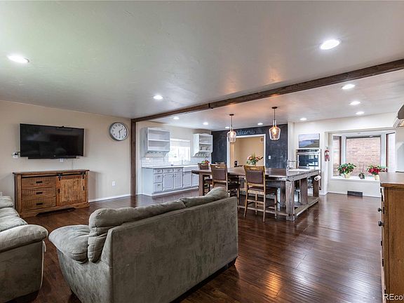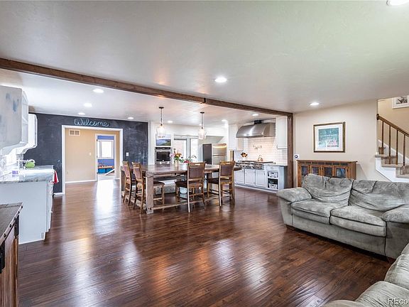 This gorgeous 5 bed/4 bath home sits on a corner lot and backs to a greenbelt/walking trail. Custom floors in foyer/family room, wood burning white washed fireplace, sliding door (Renewal by Anderson) is only 2 years old. Living room opens to the very spacious kitchen which features custom 8'x 8' island/table with built-in sink, double ovens, DCS gas range (6 burner with griddle) with pot filler and hood, chalk board wall, Kitchen Aid appliances and stone countertops. This home has a main floor master with en-suite bath and walk-in closet, as well as an upstairs master with private bath and balcony overlooking backyard. 3 additional spacious bedrooms upstairs (2 with walk-in closets) and a full bathroom with premium vinyl flooring. Laundry/mudroom with powder room leads to oversized garage. Garage features epoxy coated floors, built in cabinets/shelves, and additional mudroom/workshop area. The basement features a home theatre with retractable built -n projection screen and surround sound, there is also a built-in castle under the basement stairs. The beautiful backyard has a covered porch and paver patio, mature trees, and cement RV pad. Roof, gutters and AC are 2 years old. Radon mitigation system installed. Newer paint throughout most of the home. Less than 1 mile to parks, splash pad, water park, walking trails, grocery store, and so much more. NO HOA. Easy access to I-76, Highway 85 and E470. Don't miss out, come see it today!