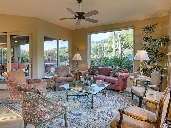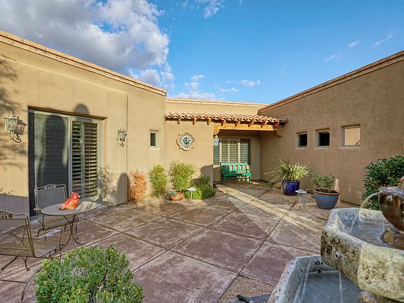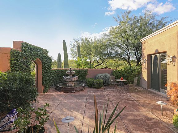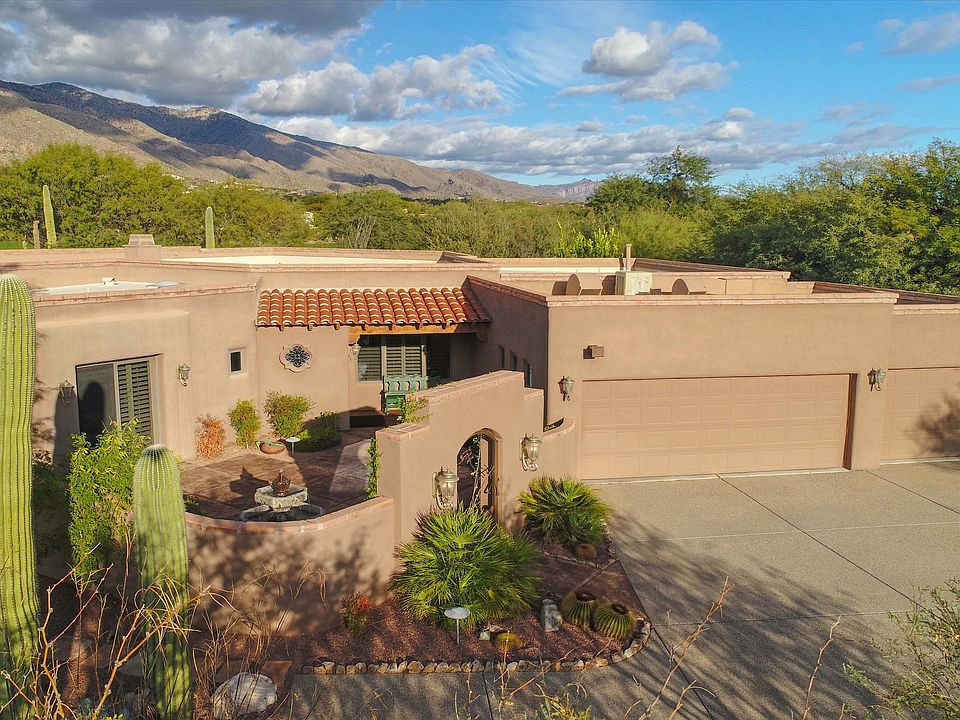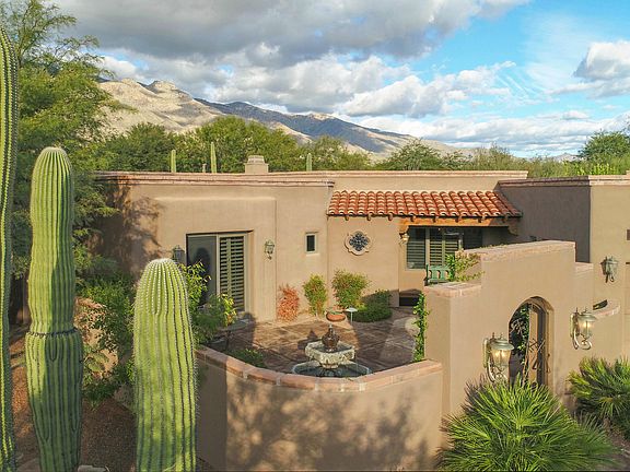 Spectacular home located on the fairway with panoramic views of the Catalina Mountains in La Paloma Country Club Estates. The front court yard entrance features a large seating area, fountain, and custom iron gate. The huge kitchen features stainless appliances, a curved granite breakfast bar, loads of cabinet space, a center island, and a built in desk area, and walk-in pantry. The spacious master suite has a lux bath with his/her closets & vanities, and access to the covered patio and yard. An adjacent office has two walls of built-ins and sliding doors to the front court yard. The yard has multiple seating areas, and out-door kitchen, an outdoor fireplace, elevated pool that flows into the pool, a covered patio, and mature citrus trees.