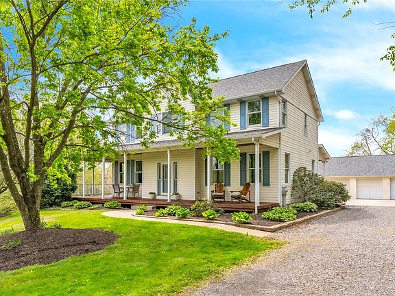 Discover this pristine 4-bedroom, 2.5-bathroom home set in a stunning landscape. A grand 72-foot wraparound porch invites you to enjoy endless breathtaking views. Inside, an inviting foyer leads to a spacious living area with French doors, abundant natural light, and a dedicated office space. The updated kitchen features granite countertops, stainless steel appliances, and a large island, seamlessly connecting to a cozy hearth room. This level also includes a dining room, laundry room, and convenient powder room. Upstairs, you'll find brand new carpeting throughout. The primary suite offers a luxurious retreat with a soaking tub, newly tiled shower, dual vanities, and walk-in closet. The three additional bedrooms provide generous closet space and there's a second updated full bath. Enjoy a versatile living space off the garage with a vaulted ceiling, kitchenette, and full bath—perfect for entertaining or multigenerational living. Plus, there's ample storage above the three-car garage!