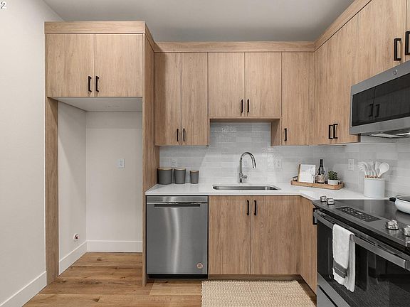 Gorgeous new construction condo in hot Arbor Lodge w/ideal proximity to N PDXs popular treats,shops,parks&transit! Thoughtfully designed&flooding w/light this impeccable open concept home boasts 2bed/1.1 baths w/high-end features,tall&vaulted ceilings&neutral designer tones!Quality can be seen w/kitchen boasting custom cabs,gorgeous tilework,slab counters SS apps,expansive windows&sliders out to fenced bkyrd!Amazing quality&peace of mind plus BuilderWarranty + AC! Phenomenal 100BikeScore!