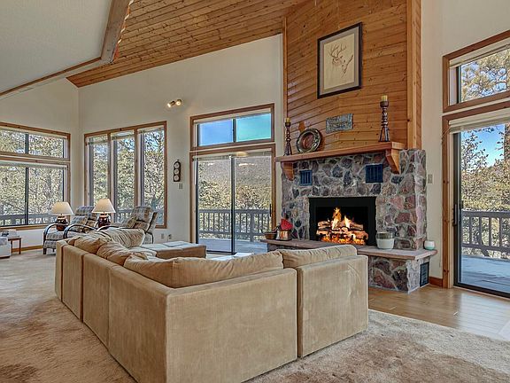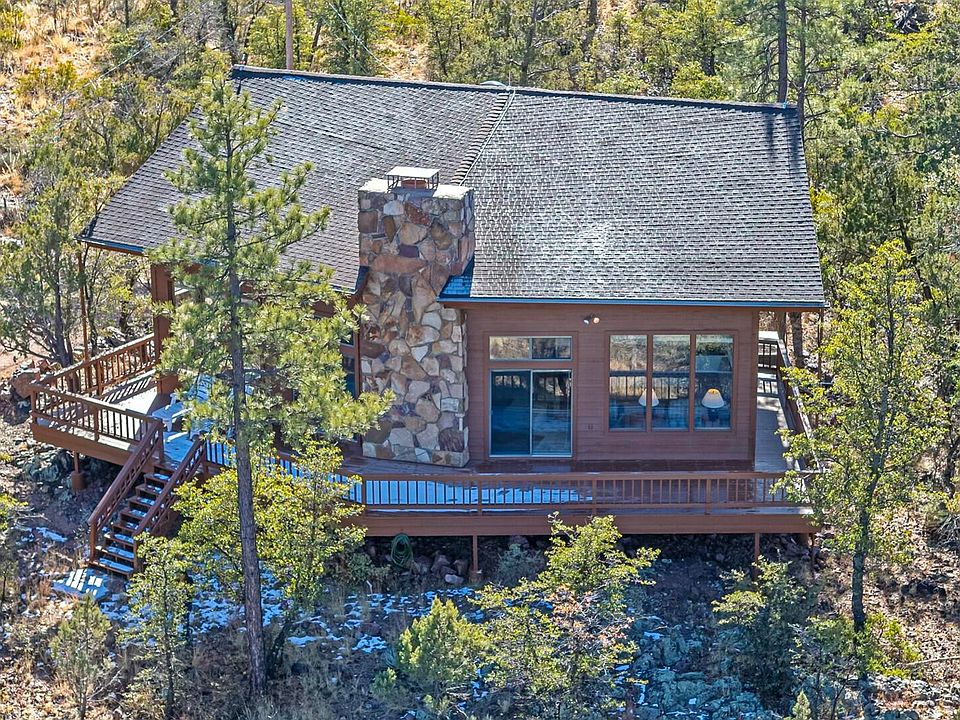 Nestled on a serene half-acre property, this home offers breathtaking panoramic views and total privacy, surrounded by tall pines. The property even backs up to the national forest giving you direct access to nature right from your backyard. Inside, the stunning wood cathedral ceilings and a wall of windows frame the incredible views of Pine Creek Canyon and the Mogollon Rim, filling the space with light and warmth. A massive stone-faced fireplace serves as the centerpiece of the main living area, creating a cozy yet dramatic vibe. This two-level home features one bedroom and one bath on the lower level and two bedrooms and bath on second level. Step outside to enjoy the large deck, perfect for soaking up the scenery or entertaining. With forced air heating and cooling, you will be comfortable year-round. Plus when the mode strikes, you can simply walk into the forest and embrace the great outdoors.