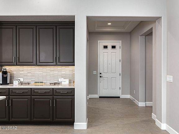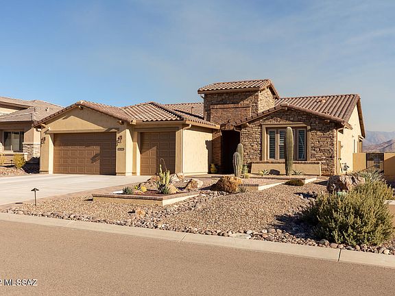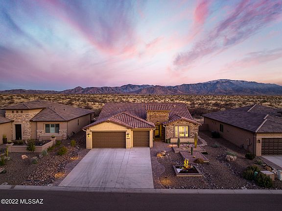 This stunning 180 degree panoramic mountain view will capture your breath as you enter into this exceptionally upgraded contemporary 2,410 sf Vienta model built in 2019. Beautiful extensive landscaping, fully fenced, and privacy on one of SaddleBrooke Ranch's best premier lots! This two bedroom with sitting room plan is designed in a soft grey color palette that possesses calm & tranquility. Great room concept leads to an exceptional kitchen that offers white sand quartz counters, matte black GE Cafe series stainless steel appliances, island w/blanco sink upgraded cabinets w/pulls, roll-out shelves, tile backsplash & soft close cabinets & drawers. Family RM has under TV cabinets, stack stone wall, walk-up wet bar w/blanco sink & wine cooler & ceiling speakers. Master suite is spacious...
