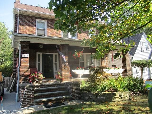 Solid Brick Colonial with beautiful covered front porch! 3 bedrooms and 2 full baths. Living room features fireplace and hardwood flooring. Formal dining room with built-in cabinets & seat, natural woodwork and hardwood flooring. Kitchen with breakfast nook and walk-in pantry. Enclosed back porch, fenced in backyard and patio. 2 car detached garage. Replacement windows throughout, younger roof, glass block windows in basement & updated electric panel. This is a well cared for home ready for its new owner!